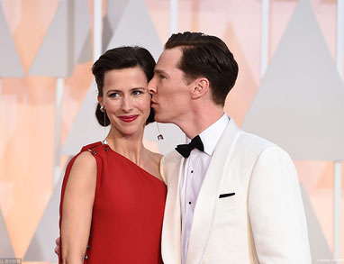 《模仿游戏》男主角本尼迪克特·康伯巴奇身着白色西服搭配黑色领结携手身怀六甲,身着浪凡 (Lanvin) 红色斜肩长裙的新婚妻子苏菲·亨特亮相红毯。他俩选在刚刚过去的情人节这天完成终身大事,令粉丝忍不住表示:“我恨情人节!”。据悉,两人2009年拍摄电影时因戏结缘。
