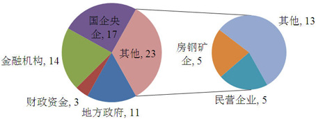 三则地方政府、财政资金和央企国企的三种股东背景将承担最后贷款人角色,即有政府的隐性担保措施。分析68家信托公司的控股股东背景,除隐性控股股东外,68家信托公司中由地方政府下属的国资委或城投公司控股的信托公司有11家,如北京信托和甘肃信托等;由财政资金控股的信托公司有3家,如东莞信托和西藏信托等;由金融机构控股的公司有14家,如兴业信托,由国企央企控股的信托公司则有17家,详见图4。最后,《信托公司管理办法》中第55条规定:信托公司已经或可能发生信用危机,严重影响受益人合法权益的,中国银监会可依法对该公司实行接管或督促机构重组。