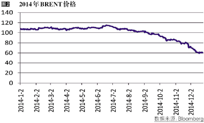 2014年,WTI开于95.44美元/桶,收于53.91美元/桶,全年跌幅43.51%;BRENT开于107.65美元/桶,收于57.51美元/桶,全年跌幅46.58%。WTI和BRENT原油的价格2014年均从年中起呈不断下跌趋势。(见图1、图2)