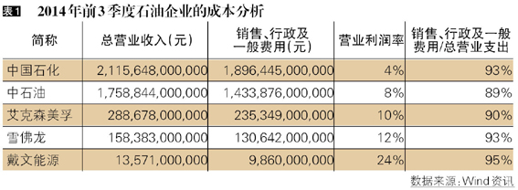 我们选取了五家全球大型的石油生产企业,研究后发现中国石化、中石油、艾克森美孚、雪佛龙、戴文能源的总营业收入递减,但营业利润率却递增;销售、行政及一般费用都占据了总营业支出的90%左右。(见表1)
