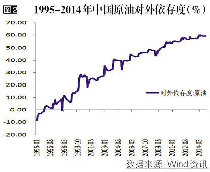 关于原油进口依存度,2014年美国由于本土原油挤占进口原油份额,前10月美国原油进口量735万桶/日,较2013年同期下滑了40万桶/日,原油进口依存度由2009年的62%降至目前46%。2014年据Bloomberg测算中国原油进口依存度已接近突破60%。(见图 2)