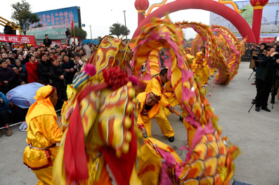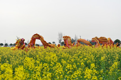 阳春三月是南方踏青的季节,四川省广汉市西高镇村民栽种10万亩的油菜农作物,遍地田间菜花现正盛开。当地政府在油菜花盛开时节,将舞龙、舞狮、唱川戏相结合,闹春耕,预示来年雨调风顺,五谷丰登,龙舞戏春风。