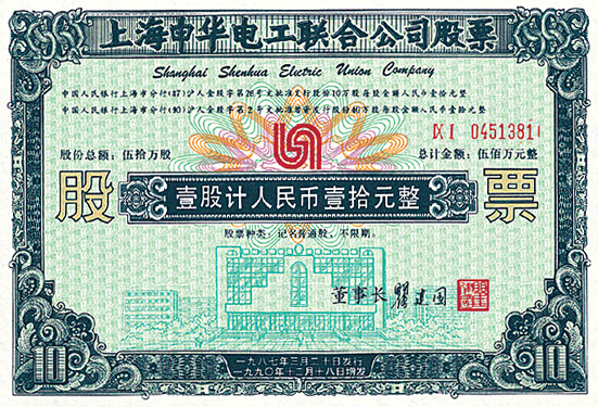 股票凭证印制非常精美,不仅记录了认购的股权数量和金额,且题材广泛、图案精,具有非常好的防伪性和流通性,材质也上乘,这些优势无疑赢得集藏者青睐。随着无纸化的实行和股票基本属性的消失,大多数股证和认股证被大量回收和抛弃,目前上世纪80年代发行的股证存世量已大幅减少,个别品种成为藏界珍品,市场价格不断跃升,如这个时期发行的股票中,“延中实业”、“申华电工”、“飞乐音响”和“豫园商城”等上海“老八股”已成珍罕品种,其中在上个世纪80年代由世纪伟人邓小平赠送美国纽约证交所董事长而名躁一时的“飞乐音响”股票,市价一度臻至10万元之上,“氯碱化工”全套的价格也达8000元,“申华实业”的市价更是创出18000元高位,它们的价值有时候比目前交易的股票还要高得多。
