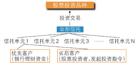 各种入市形式中,伞形信托最为炙手可热,预估市场存量约为4000亿元。所谓伞形信托,其全称为伞形结构化信托,其中“伞形”是指同一个信托计划下设两个或两个以上信托单元,这解决了信托账户新开户的问题;“结构化”则是指每个信托单元都是由优先级受益权和劣后级受益权构成,认购劣后级受益权的客户将以全部出资担保优先级客户的固定收益和本金安全,当然也享有可能较为可观的剩余投资收益。通常地,银行理财资金扮演的是优先级角色,劣后级受益权则由私募投资机构或个人认购,即为实际融资方。劣后级和优先级一般按照1:1-1:5的比例配置资金,从而达到杠杆融资的效果。