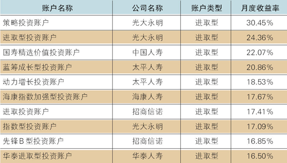 本月共有182个获得正收益率,其中包括保守型32个、稳健型57个、平衡型42个、进取型51个。以上四类投资账户的月度平均收益率依次为0.80%、4.50%、10.10%和12.70%。月度收益表现最好的10个投资账户全部为进取型,排名首位的是光大永明的策略投资账户。(表2)