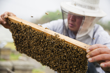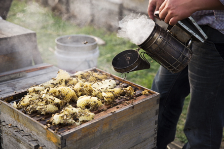 蜂巢被收集到一起,用喷烟器驱走逗留的蜜蜂,再加工制作成蜂蜡。喷烟器里装的是加工蜂蜡时形成的渣滓,既无毒无害,驱蜂效果又好。