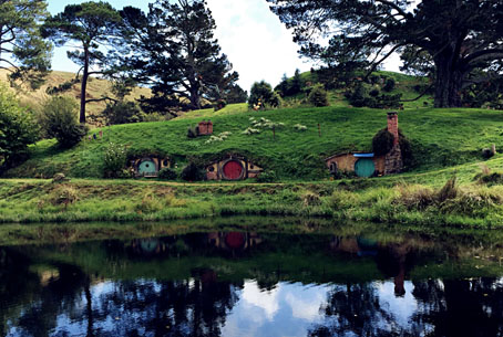 罗托路阿,位于新西兰北岛中部的城市。霍比特人的拍摄地位于玛塔玛塔的亚历山大家庭农场。自驾的车子只能停在外面的公共停车场,买了票,参加Hobbiton Movie Set Tour,一拨拨的由当地导游带着坐景区的车进去,上车前,已看到不远处成群的牛羊,悠闲的散着步,成片的绿油油的草地就这样毫无征兆的展现在了眼前,进到农场,站在山坡上望去,终于明白为什么人的性格和成长的环境是有密切关系的了。片中的霍比特人自然羞怯且善良,平均寿命约100岁,他们33岁的时候才是成年,55岁才算中年,生活在这美如画的环境里,不长寿是得不到原谅的。农场风光淳朴而不造作,雕琢还不露痕迹,霍比特人住的底袋洞和木屋散落在翠绿的山坡上和山脚下,房屋的窗户大多呈圆拱形。如镜的湖泊点缀在山峦间,灵动闪亮,小桥、篱笆、大南瓜还有各种各样袖珍的生活用品,是霍比特人精心打造的童话世界。