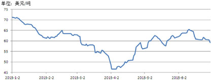 国内大连商品交易所铁矿石期货②经历了两轮活跃合约的转换,1月合约和5月合约先后完成交割。目前的活跃合约和次活跃合约换至1509合约和1601合约,近月合约I1509对远月合约I1601呈溢价状态。5月中旬前,近月和远月的跨月价差基本持稳,但5月中旬后,近月合约对远月合约的溢价明显拉宽,并在6月中下旬TSI升至二季度高位后一度拉宽至25元/吨左右。截至6月30日,1509合约和1601合约分别收报416元/吨和397元/吨。(图7)