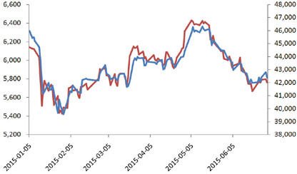 2015年伦铜市场开于6273.5美元/吨,半年末收于5762美元/吨,最高价6481美元/吨,最低价5339.5美元/吨,下跌8.31%。沪铜连续合约走势大体与之一致,开于45500元/吨,收于42090元/吨,最高价46390元/吨,最低价38860元/吨,下跌7.74%。(图8)