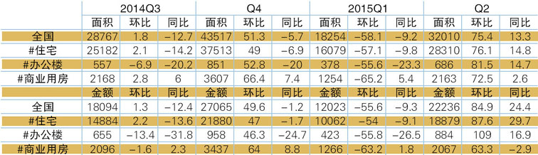 表5 2014Q3-2015Q2商品房销售情况 单位:万平方米,亿元,%