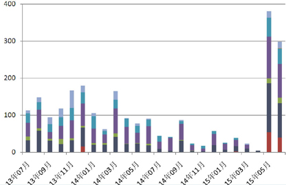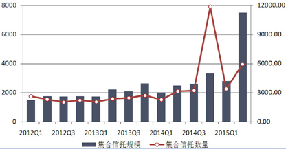 第二季度集合信托增速显著提升,主要是由于证券投资领域和其他领域产品上涨明显。该季度证券投资类信托的环比增速达到了36.12%,其他领域集合信托环比增速达到了26.86%。证券投资集合信托上涨的主要原因是伞形信托、二级市场配资类信托的增长——其增长的逻辑起点是A股的坚挺和监管的宽松。但是,这两个基础都不能持续,原因有:其一,A股已经从牛市变成了猴市;其二,监管层对场外配资持不鼓励,甚至是否定态度,二级市场去杠杆势在必行。其他领域产品除了传统的资金池产品外,可能还包括一些投向股权市场的、股票市场的创新类产品。