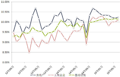 2015年上半年,集合信托产品收益相对疲软,除基础设施领域外,房地产、工商企业等主要领域产品收益率均有明显下降。这主要是因为经济下滑,实业投资收益下降,加之整个资金面宽松。基础设施融资一般对利率较为刚性,故受到的影响不大。收益普遍在二季度反弹,这是因为股市的火爆拉高了投资者投资的机会成本。(图5)