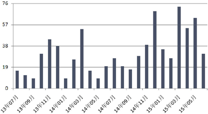 2015上半年,阳光私募共成立了283款,较去年同期增加150款,增幅112.78%;环比增加82款,增幅40.80%。应该看到,2015年上半年,阳光私募的发行基本上与股市的行情呈正相关。(图6)