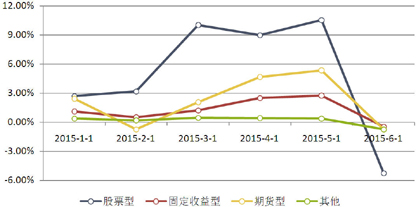 2015年上半年,券商理财产品共发行1546款,较去年同期增加235款,增幅39.50%;环比增加558款,增幅205.15%。其中,混合型261款,占比33.76%;债券型248款,占比32.08%;FOF产品101款,占比13.07%;股票型97款,占比12.55%;货币市场型27款,占比3.49%;QDII产品1款,占比0.13%;其他产品38款,占比4.92%。与阳光私募不同的是,券商集合理财在5月和6月出现井喷,即便是在大盘回调的6月份,发行数量仍然较多。(图9)