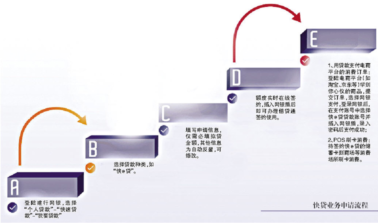 “快贷”——快速贷款,是建行于2014年12月13日推出的首个全流程个人网上自助贷款产品,旗下包括“快e贷”、“融e贷”、“质押贷”三款产品。该产品应用大数据原理,对客户在建行的资产、负债和信用等海量金融信息进行深度整合分析,利用长尾效应最大限度地扩大了贷款客户的覆盖面,贷款门槛低至千元,是个人消费者和小微群体的灵活之选。“快贷”贷款额度最高可达500万元,更重要的是审批答复只要几分钟,根本无需客户亲临建行网点,是国内银行首家推出真正的网上贷款。