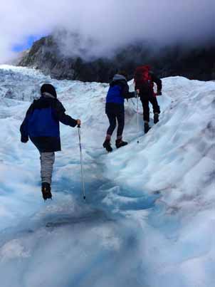 Fox和Franz Josef是世界上仅有的三个与雨林相连的冰川中的两个,另一个是位于阿根廷的Perito Mereno Glacier,因此十分具有观赏价值。徒步福斯冰川有三种方式:1,坐皮划艇在山底的冰河一带欣赏冰川奇景;2,从山麓开始直接徒步,分为半日游和全日游,价格便宜且不受天气影响,但对体力要求比较大;3,直接坐直升机到山顶开始冰川徒步,景观性和享受度最高,冰川公司会提早挖好道路,只要跟着向导一路前行就好,但受天气影响极大,所以只能起飞前15分钟才能得知是否成形。我们当然选择最后一种方式,省时省力又能最大限度的观赏到冰川奇观。很幸运的在2点15分通知可以按时起飞上冰川。于是,一行人在专业向导的带领下做了安全知识宣讲后便等候前来接我们上山的直升飞机了。