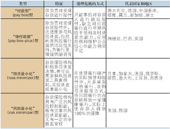 世界各国所采用的存款保险制度,根据国际存款保险协会对国际上存款保险制度的运作情况进行了全面评估和归纳总结,指出目前存款保险主要有三种模式:一是“付款箱”,还可以细分为纯粹的“付款箱”型、“强付款箱”型,仅在银行倒闭后负责赔付存款人,典型的如英国(危机前)、澳大利亚;二是“损失最小化”,存款保险还拥有风险监测和处置功能,典型的如日本、加拿大、法国和俄罗斯等;三是“风险最小化”,存款保险进一步具有早期纠正和补充监管功能,典型的如美国、韩国和我国台湾地区。第一种被称为“狭义”的存款保险,后两种则被称为“广义”的存款保险。近年来,越来越多的国家积极改革,向“损失最小化”,和“风险最小化”模式靠拢。