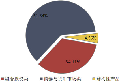 从投向类型来看,债券与货币市场类产品发行了3406款,环比减少388款,市场占比上升0.68个百分点至61.34%;组合投资类产品发行了1894款,环比减少296款,市场占比下降0.90个百分点至34.11%;结构性产品发行了253款,环比减少16款,市场占比上升0.26个百分点至4.56%;融资类产品没有发行,环比减少2款,市场占比下降0.03个百分点至0%。(图4)