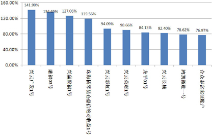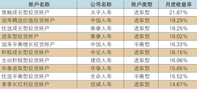 受A股市场大幅反弹的影响,本月共有180个获得正收益率,其中包括保守型32个、稳健型55个、平衡型42个、进取型51个。以上四类投资账户的月度平均收益率依次为0.45%、2.88%、8.62%和10.82%。月度收益表现最好的10个投资账户中,进取型8个,平衡型2个,排名首位的是太平人寿的策略成长型投资账户。(表2)