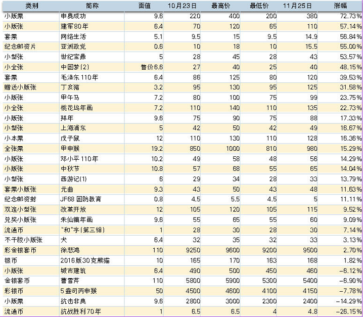 11月下旬,第三轮生肖中的“甲申猴”套票、全张票、小版张、赠送小版张和小本票分别上扬到16元、980元、370元、180元和135元,“丙戌狗”套票、全张票、小版张、赠送小版张和小本票分别攀升至5元、380元、110元、210元和65元,而“戊子鼠”套票、全张票、小版张、赠送小版张和小本票分别上涨到9.5元、430元、110元、160元和130元,“庚寅虎”套票、全张票、小版张、赠送小版张和小本票分别走高至7.5元、820元、115元、62元和69元,“壬辰龙”套票、全张票、小版张、赠送小版张和小本票分别上攀到6元、1000元、185元、80元和60元,“甲午马”套票、全张票、小版张、赠送小版张和小本票分别上扬到5元、255元、100元、53元和35元。