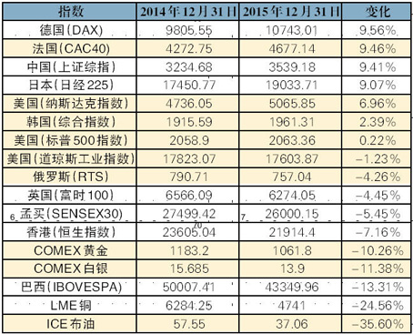 2015年主要股市及大宗商品表现