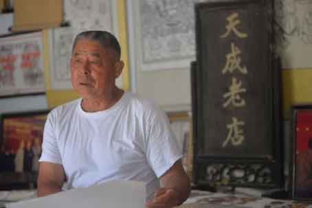 坐在我面前的尹国全师傅已经60多岁了,虽然他名望很高,但依然是一身纯朴的装束,一幅朴实的农民形象。他不善言辞,坐在凳子上,凝望着屋外,脸上写满了沧桑,满是老茧的两手不时地摆弄着刻刀。说起天成老店的历史,尹师傅打开了话匣子。