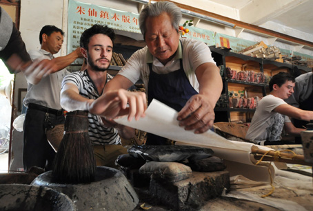 来自英国的留学生到开封市朱仙镇体验木版年画套色印刷工艺 图/CFP