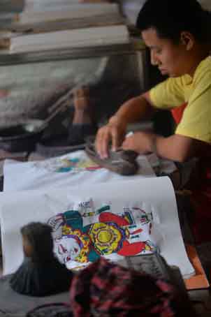 “不行。”尹师傅停下手中的活儿回答说:“这是祖祖辈辈沿袭下来的,包括一些模板,都是老辈留下来的,宁简勿繁,这就是传统木版年画的特色。”尹师傅同时也提出了他自己的看法:“发展朱仙镇木版年画,首先应该尊重原版。朱仙镇木版年画的特色就在于线条粗犷,人物形象夸张、饱满,还有就是纯植物熬制的颜料,全部都是沿用的传统工艺。如果一味追求精细化、批量化生产,会失去木版年画原有的味道。”