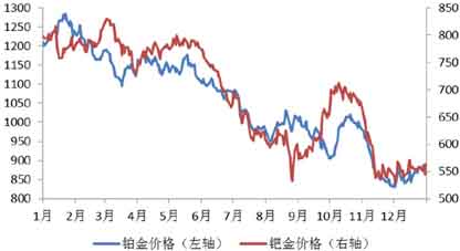 2015年铂、钯价格大幅下跌,走势弱于黄金