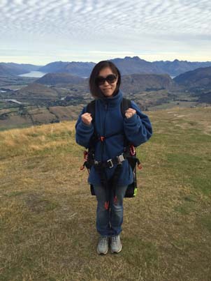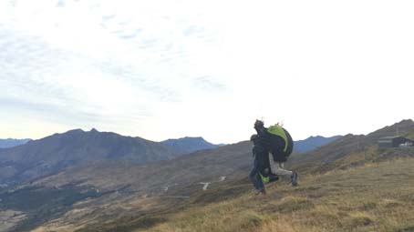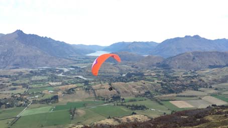 Sky Trek是皇后镇最好的滑翔伞公司之一,提供交通从皇后镇中心接送到飞行地点。起飞点位于皇冠锋,绕着山路接近半小时,到了一个高度大约在1143--1676米的悬崖顶上停下了车。由专业教练帮我穿好了装备后就准备起飞了,背着重重的大袋子,说是一路狂跑,可真的跑不动,最后一刻只感觉被人从身后推了一把,双脚离地,飞了出去,竟毫无失重感。层峦的山峰、翠绿的草坪已在脚下,在湛蓝的天空中任由我翱翔。快降落的时候,看到前面一个自己玩儿的人正在高空中做着各种翻跟头的动作,心血来潮的教练问我想不想试一下?我说好啊!于是,在教练一声“ready?”后,我们便开始“腾云驾雾”了,正的、反的、圆周的,瞬间的拉升和下降,只觉天空在我眼前旋转,大地在我面前颠倒了方向。