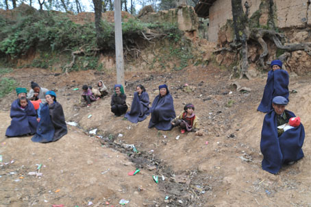 到了一片稍微平整些的地方,但见满地大坨大坨的牛粪,一堵堵歪歪斜斜裂着大缝、长着荒草的矮土墙围着只露着黑瓦的房顶。有三三两两村民裹着深色的斗篷蹲在墙角,雕塑般一动不动,几个小孩子在地上滚来爬去,一身的泥污。见村长过来,有村民热情地招呼。走进一户农家的大门,说是大门其实就是一个不弯腰会碰头的门洞,所谓的门也只是用参差不齐的几块木板拼成的一块大挡板,朽得已经看不出木头的质地和成色。