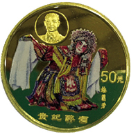 “贵妃醉酒”是京剧大师梅兰芳倾尽毕生心血精雕细刻的拿手杰作之一,而《贵妃醉酒》纪念币正是取材于京剧“贵妃醉酒”中的舞台经典形象。梅兰芳(1894~1961年),名澜,字畹华,出身京剧世家,是梅巧玲之孙。8岁学戏,11岁登台,与尚小云、程砚秋、荀慧生并称“四大花旦”。善演青衣、花旦、刀马旦,他对戏曲舞蹈的丰富、完美,有着超越前尘的卓越贡献。他一生创演了许多载歌载舞的剧目。在这些剧目中,他从武术、古画和戏曲各行当演技中,提炼编创了许多极为精美的舞蹈,在一些传统青衣剧目如《宇宙锋》、《洛神》、《贵妃醉酒》中,他出色地运用舞蹈表现人物,在其巧妙安排下成为描绘人物心境、塑造人物形象的点石成金的舞蹈语言。