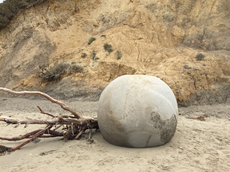 在前往库克山的路上,散落在奥玛鲁南方40公里长的海岸线上的大圆石,当潮水退去时便显露了出来。据毛利人的传说,这是一千多年前,航海大战舟阿雷德欧鲁号在岸边沉没时所滚出来的瓜果。后来经过研究,认为这些大圆石形成于6500万年前。形成的原因是由于会结晶的钙与碳酸盐微粒的海底沉积泥,经过400万年,一点点慢慢形成了这些大圆石。