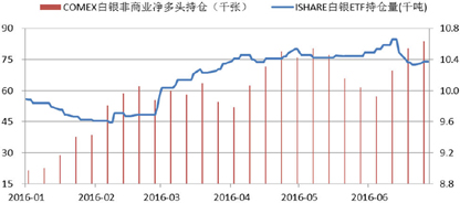 2016年上半年,CFTC白银非商业净多头大幅上涨,截至6月28日当周净多头持仓达83,661张,是去年底的3.04倍。1-2月快速上涨,3-6月震荡攀升,基本与白银的走势行情一致,显示白银行情与投机资金流向联系密切,相对而言,ETF持仓变动与白银价格的关联性要弱一些。(图6)