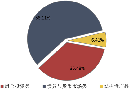 从投向类型来看,债券与货币市场类产品发行了4652款,环比增加217款,市场占比上升1.14个百分点至58.11%;组合投资类产品发行了2840款,环比减少68款,市场占比下降1.88个百分点至35.48%;结构性产品发行了513款,环比增加72款,市场占比上升0.74个百分点至6.41%。(图4)