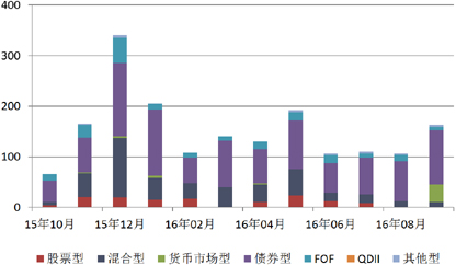 本月19家证券公司或其资管子公司发行了163款券商理财产品,环比增加57款,升幅为53.77%,平均首发目标规模6.49亿元,环比减少6.55亿元,降幅为50.23%;债券型产品发行了107款,环比增加48款,升幅为81.36%,平均首发目标规模4.31亿元,环比减少6.74亿元,降幅为61.03%;混合型产品发行了10款,环比减少7款,降幅为41.18%,平均首发目标规模18.96亿元,环比减少0.10亿元,降幅为0.53%;FOF产品发行了7款,环比减少8款,降幅为53.33%,平均首发目标规模9.07亿元,环比减少12.73亿元,降幅为58.38%;货币市场型产品发行了35款,平均首发目标规模50.00亿元;其他型产品发行了4款,环比增加1款,升幅为33.33%,平均首发目标规模50.00亿元,环比增加48.75亿元,升幅为3900.00%。(图9)