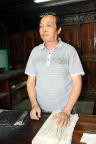 “天气干燥动作要快,天气湿润的话可慢一点。”王士生先用刷子在印刷母板上刷上水,过了几分钟再快速均匀地刷上墨汁,接着在母板上覆上印刷纸张,随即用棕刷子在纸张上面刷拓,一连贯的动作一气呵成,不一会儿的功夫,一张拓印好的精致样张就展现在了眼前。