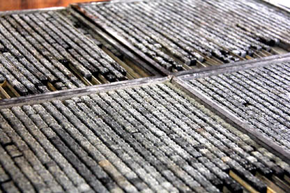 王士生就是在展示馆的演示室里面演示的印刷术。走进演示室,顿时墨香扑鼻。屋子并不大,是展柜的布局。几张拼合在一起的长方形大木桌子,以反“L”形隔开了里外。面向大门的横向大木桌上,放着几碗水、墨汁、墨刷、墨板和棕刷;旁侧的大木桌上,则罩着玻璃柜,柜内,是一盘盘已经排好版的字盘,字盘上面密密麻麻地刻着一个个字模,字模黑如墨碳,大约是在墨汁里浸润的时间长久所致,组成可任意编排的木活字印刷术的印刷母版;里面靠墙也是几张拼合的长方形大木桌,上面,同样放着一盘盘黑乎乎的排版用的印刷母版。