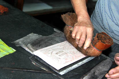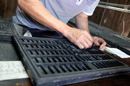 “用棠梨木做活字,每个字块大小高低都一样,在装置活字的木框里,每个字行之间都用木栏夹紧,固定好的模板就可以用直接用于印刷了。” 印刷用墨则是一个很讲究的技术活儿,不慎就会导致拓印失败。如果失败了会有两种情况,一种会因为墨多了,字印显得湿而模糊,另外一种因为量少了而字印不清或偏白。王士生刚拓印好的这一张,不干不沾,图案字迹清晰,显然比较成功。