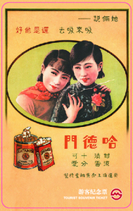 第三枚地铁纪念卡的画面,是大名鼎鼎的哈德门香烟广告,画中双姝楚楚动人,纤纤玉指夹着一支冒青烟的香烟,文静女孩吞云吐雾,对男性消费者而言杀伤力是巨大的。