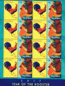 在各国2017年发行的“鸡年”邮票上,运用金色来作为图案的并非菲律宾一国,还有许多国家或地区发行的“鸡年”邮票上也同样采用金鸡来营造喜庆氛围,并结合了一些特殊印制工艺,让人感到耳目一新。如马达加斯加发行的“鸡年”小型张就以金鸡为主图,再辅以异形票幅,同样显得很出彩。英属泽西岛在红底的衬托下,一只金色的雄鸡跃然纸上,加上中国吉祥花卉纹饰,言简意赅地凸显了主题思想。列支敦士登继续以镂空的剪纸风格表现“鸡年”,小全张的外围则延续异形风格,使用了昂首挺立的公鸡形象,而邮票四周的面值、国名和中文“鸡”使用烫金工艺。