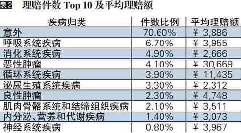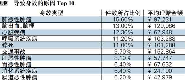 在导致身故的前十大原因中,恶性肿瘤排到了第一位,从理赔金额推算,癌症的治疗费用至少将近10万元。值得注意的是,交通事故也“榜上有名”,说明交通意外风险已到了不可忽视的程度。