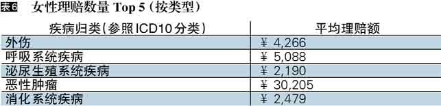 比较以上两项数据,无论男性女性,外伤均是理赔数量最多的案件,通常这种外伤都是因为意外引起的。数据上,女性出现意外的比例并不显著低于男性,而意外中女性的外伤所需花费要高于男性。女性朋友要认识到,购买一份意外险是很有必要的。同时从数据上可以看出,男性女性在理赔的疾病类型上有一定差异。这里提醒各位消费者,在购买保险的时候,尽量选择针对自身性别的个性化产品,强化对某些疾病的重点保障。
