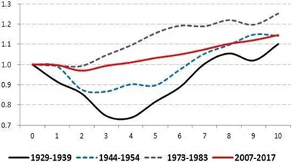 如下两图(均以危机爆发前一年的GDP为基数1,收缩为<1,1<复苏<1.1,扩张为>1.1),与前三次大危机相比,本次危机的复苏期是最长——4年(2011-2014),而且从经济增速曲线的斜率来看,本次危机虽然较早的脱离衰退,但复苏的力量是偏弱的。其背后的原因,则是经济内生新动力至今尚未显化和成形。(图1、2)