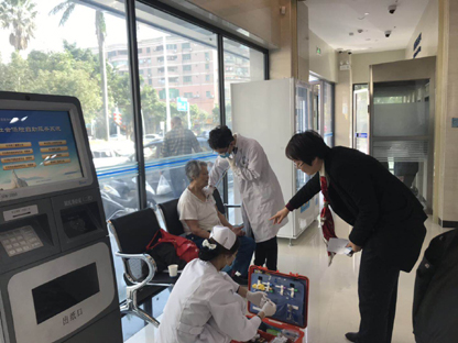 “唉!这位阿姨您没事吧!”大厅一位年迈的老奶奶孤身而坐,迅速吸引了网点负责人李文娟的注意,她手里拿着社保卡,脸色发青,头仰着天,额头冒汗靠在座椅上。