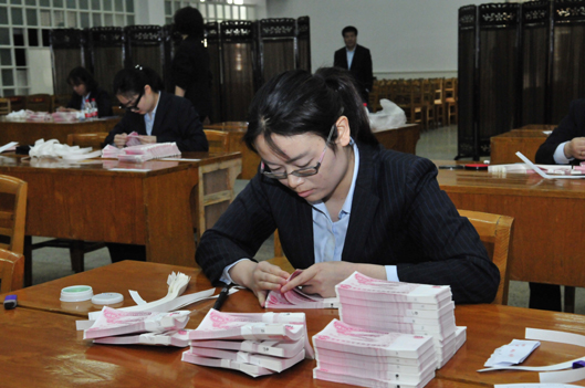 个人全能一等奖获得者杨晓晶在进行点钞比赛