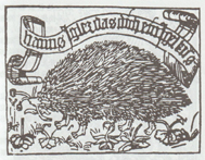 藏书票是舶来品,起源于德国。现存最早的一张藏书票,约在1450年间。这是一幅黑白木刻画,画面上是一只刺猬,嘴上衔着一枝野花,脚下落叶缤纷,画面上部的纸卷上,有一行德文,大意是“慎防刺猬随时一吻”。这欧洲的藏书标记,与中国的不一样。我国古时从唐朝起,一直沿用至今的是藏书印,即在自己收藏的书上,钤上红色印戳,这可称是篆刻艺术的展现。