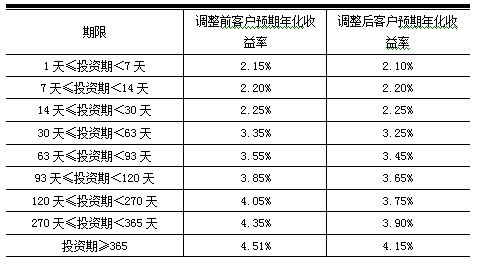 新客户预期年化收益率于2016年2月23日(含)起执行。对于2016年2月23日前已经购买成功且未赎回的所有存量客户投资本金,按照客户实际持有天数,其中2016年2月23日前持有部分执行原客户预期年化收益率,2016年2月23日(含)后持有部分自动执行新客户预期年化收益率,但以最终支付的实际年化收益率为准。