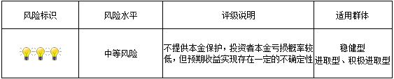 本期产品为非保本浮动收益型理财产品,不保证本金和收益,请您充分认识投资风险,谨慎投资。本期产品期限98天(中国建设银行有权对本期产品进行展期和提前终止),存续期内产品不接受申购或赎回申请。本期产品内部风险评级级别为3盏警示灯 ,风险程度属于中等风险。最不利情况下,资产组合无法回收任何本金和净收益,客户将损失全部本金。产品适合于稳健型、进取型及积极进取型客户。