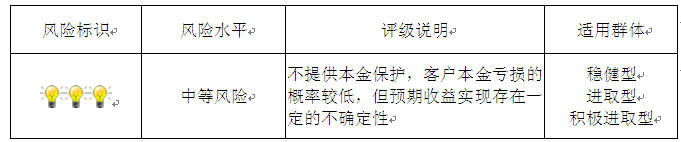 本期产品为非保本浮动收益型理财产品,不保证本金和收益,请您充分认识投资风险,谨慎投资。本期产品期限207天(中国建设银行有权对本期产品进行展期和提前终止),存续期内产品不接受申购或赎回申请。本期产品内部风险评级级别为3盏警示灯 ,风险程度属于中等风险。最不利情况下,资产组合无法回收任何本金和净收益,客户将损失全部本金。产品适合于稳健型、进取型及积极进取型客户。